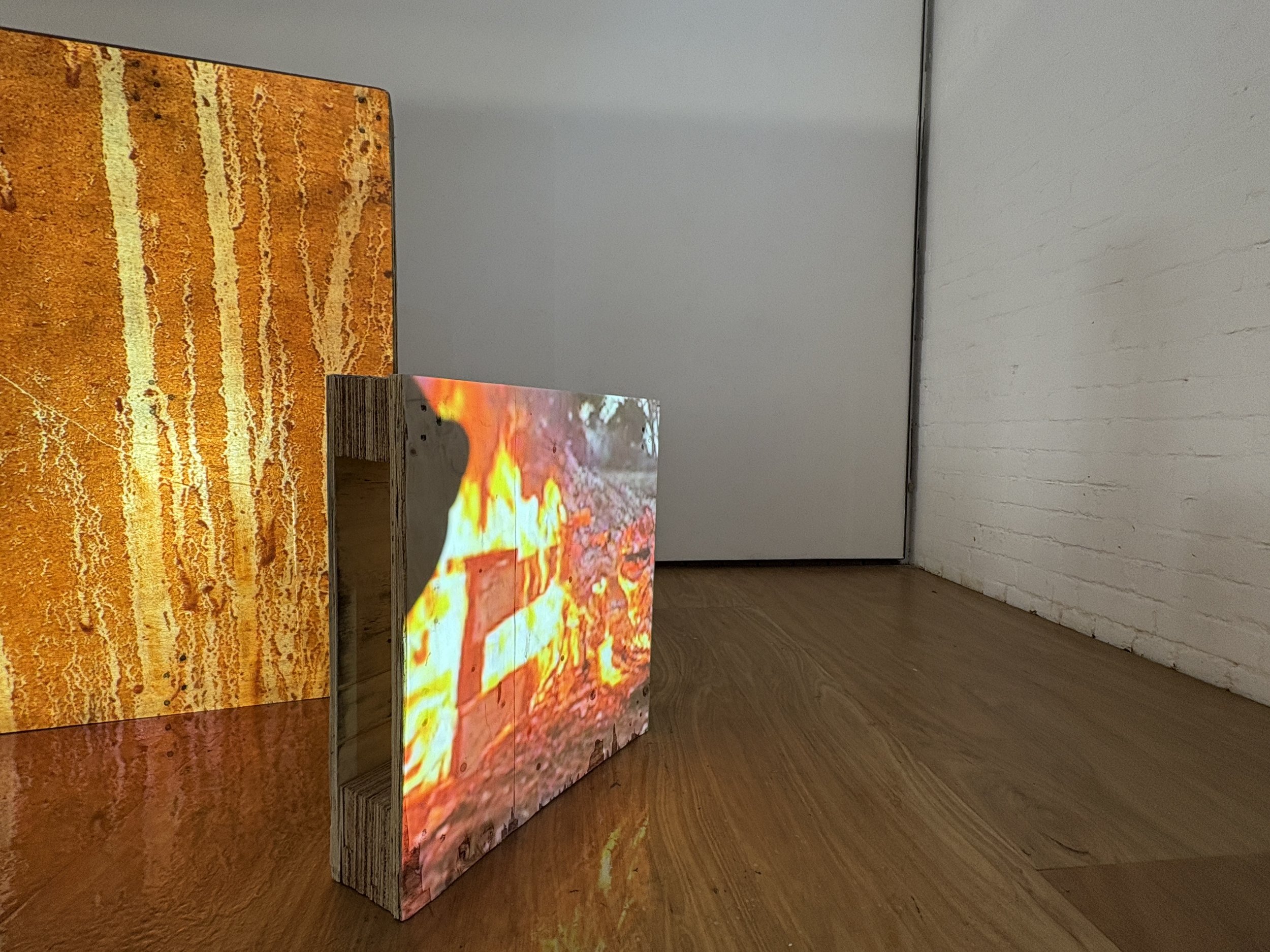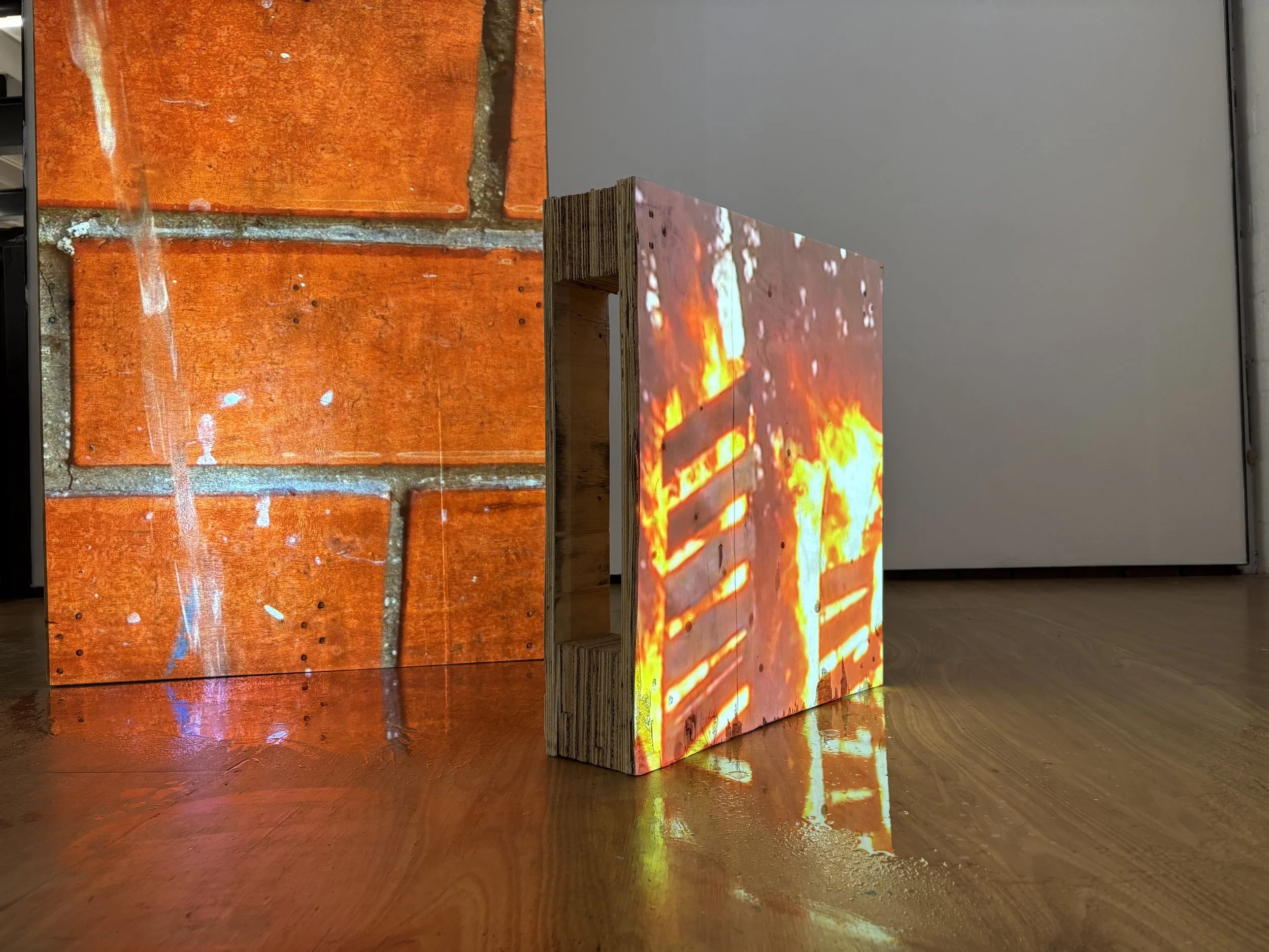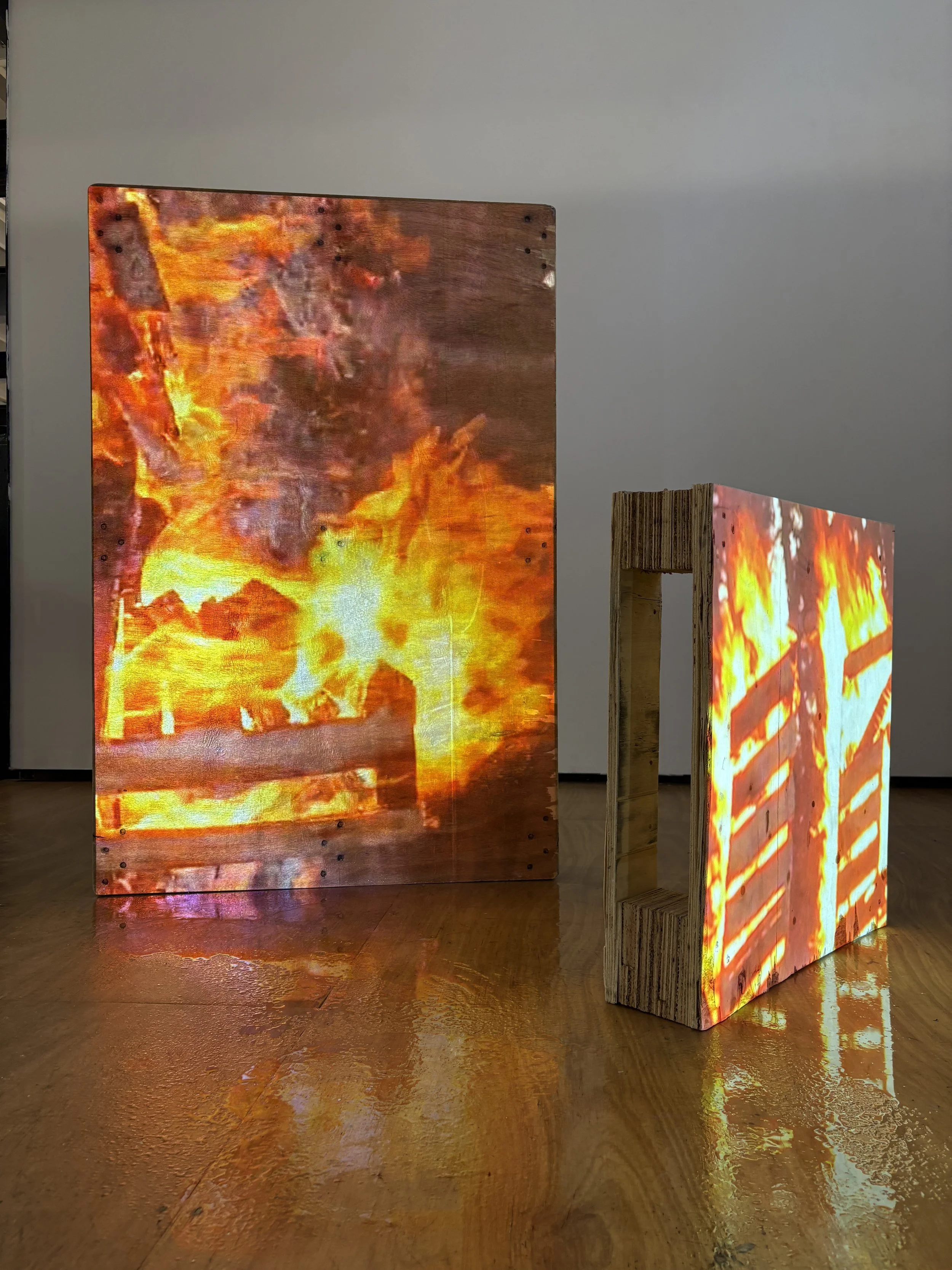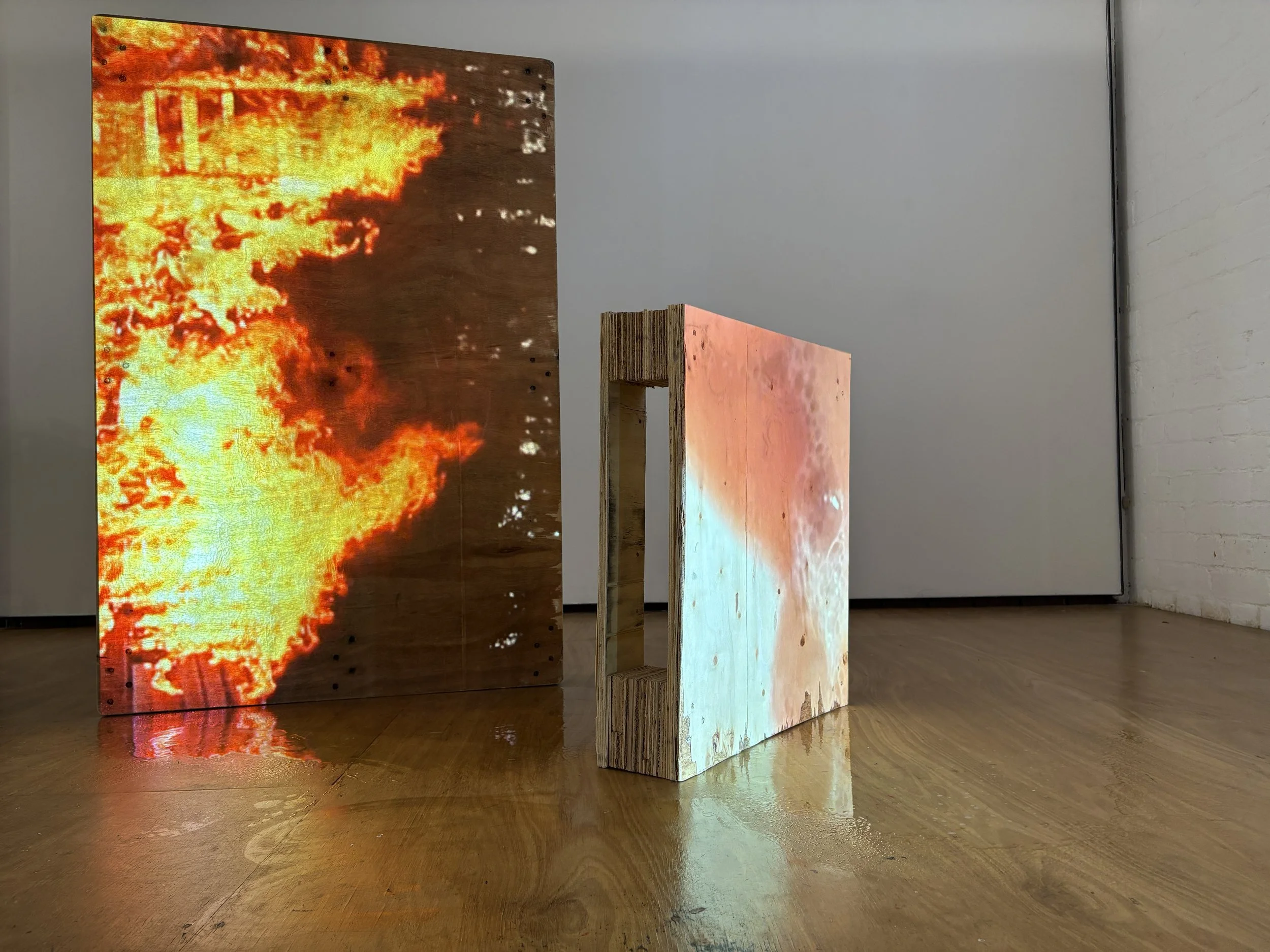 Surviving flooding has left me with a complex relationship to water, it caused so much destruction but was also the revival. Washing flood mud becomes part of everyday life in a post-natural disaster world. Washing of belongings and then washing of yourself. I wanted to incorporate this to show this intimate action. The footage of the fire from the sculpture burning began as representational and as the project evolved has become more abstracted. By turning the fire on its side it has become iteration of any possible fire. Using light to project the videos on new found pallets ensures the sculpture stays digital. It is only a projection of what is once was, now light, reflecting on the water spill on the ground and then in a flash it is gone and all that is left is a pallet.